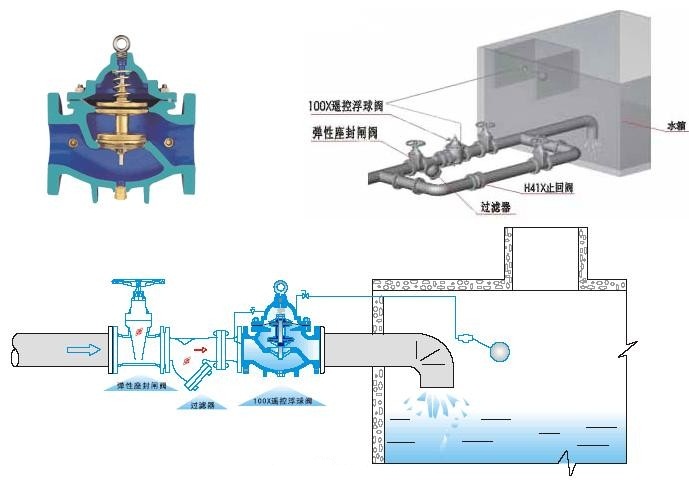 100X遙控浮球閥由主閥、針閥、球閥、浮球閥、微型過(guò)濾器等組成水力控制接管系統(tǒng),調(diào)定后,自動(dòng)控制液面高度。