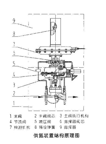 供氮裝置結構如右圖所示,將設在罐頂?shù)娜狐c的介質經(jīng)導壓管引入檢測機構(7)、介質在檢測元件上產(chǎn)生一個作用力與彈簧(8)、預緊力相平衡。當罐內壓力降低到低于供氮裝置壓力設定點時,平衡被破壞,使指揮器閥芯(6)打開,從而使閥前氣體經(jīng)減壓閥(5)、節(jié)流閥(4)、進入主閥執(zhí)行機構(3)上、下膜室,打主開閥閥芯(2)、向罐內充注氮氣;當罐內壓力升到供氮裝置壓力設定點時,由于預設彈簧力,關閉指揮器閥芯(6)又由于主閥執(zhí)行機構中彈簧作用,關閉主閥,停止供氮。